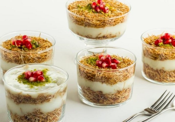 - بعدها في أكواب نضع طبقة كنافة ثم طبقة كريم بروليه ثم طبقة كنافة .