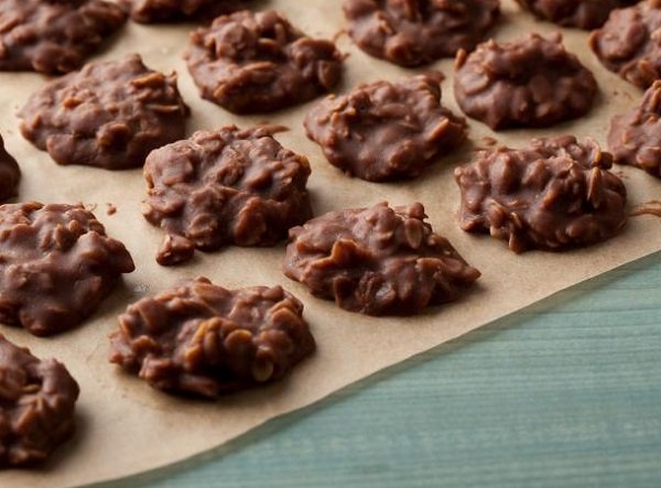الكوكيز بدون فرن ، أقراص داكنة اللون مصنوعة من زبدة الفستق الناعمة مع بودرة الكاكاو، الحليب ورقائق الشوفان، الزبدة ورشة من الملح. لا تحتاج هذه الوصفة السهلة إلى استخدام الفرن.