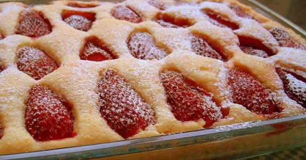 كيكة الفانيلا والفراولة كيكة سهلة وشهية وخاصة لعشاق الفراولة وهي سهلة وسريعة التحضير ومكوناتها متوفرة في البيت ومزينة بالسكر البودرة وقطع الفراولة .