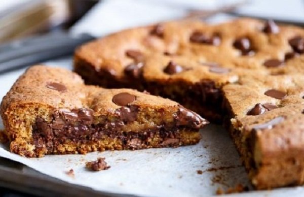 - نضع شوكولاته بين الطبقتين ثم نزين الوجه بالشوكولاته السائلة أو النوتيلا وبذلك تكون كيكة الكوكيز الطرية جاهزة للتقديم .