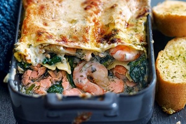 لازانيا بالروبيان وجبة غنية بالفوائد الصحية كما أنها شهية وهي تغيير عن الوجبات الإيطالية الكلاسيكية فهي تحوي خليط رائع من السبانخ وسمك السلمون والروبيان .