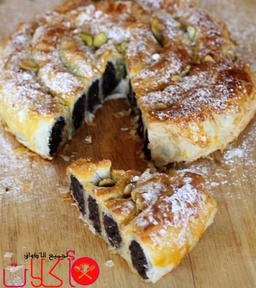 5- نقسم العجينة الثلاث كرات متساوية ونمدهم بشكل مستطيل ويجب ان تكون العجينة رقيقة جدا ونضيف الحشوة ونلف العجينة بشكل اسطواني ونلفها بشكل لولبي ونضعها على صينية مدهونة بالزيت النباتي