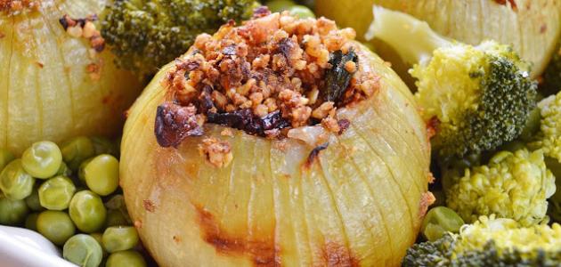 - نَفصل طبقاتِ البصل عن بعضها البعض، ونبدأ بحشوِ كل طبقةٍ بكميةٍ من حشوة الأرز، ونَلفها كما نَلف ورقِ العنب، ثمّ نُرتبها في طبق للفرن، ونكرر العملية حتى نَنتهي من لَفِّ طبقاتِ البصل كلها.