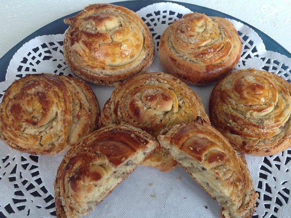- نضع ورق زبدة على صينية الفرن ونرتب المعجنات فيها وندهنها بصفار البيض ونزينها بالجوز والسمسم حسب بالذوق .