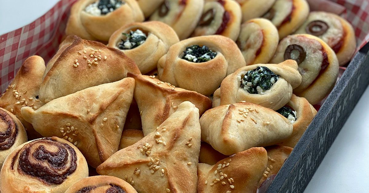 9- مدي قسم ثالث من العجينة على سطح صلب وقطّعيها الى دوائر. قطّعي اطراف العجينة جزئياً في الوسط ثمّ ضعي الحشوة. لفّي الاطراف على بعضها البعض ثمّ إدهني الوجه بالزيت وانثري حبة البركة. صفّيها على صينية مغلفة بورق زبدة واخبزيها حتى تنضج.