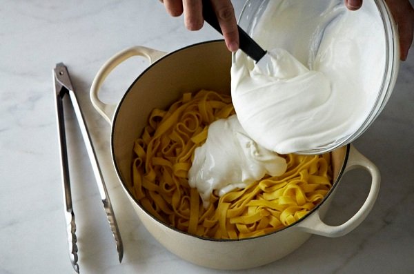 - نسكب اللبن فوق المعكرونة بعد أن تبرد