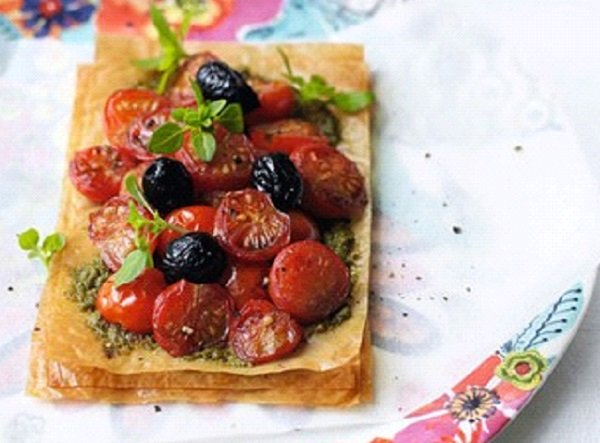 موالح بعجينة البف باستري ، عبارة عن فطائر بسيطة غنية بنكهات فصل الصيف من طماطم شيري والحبق الطازج وصلصة البيستو والزيتون الأسود كما أن شكلها شهي جداً وسهلة التحضير وتصبح جاهزة خلال ربع ساعة فقط .