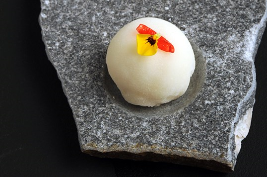 يُحشى الموتشي بالموتزاريلا آيس كريم ويُقدم مزيناً بزهور البرتقال.