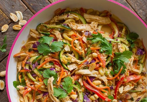 نودلز صيني بالخضار والدجاج ، خليط كريمي، صحي، وغني بالخضار المغذية، يمكن وضعه على عجينة بيتزا أو تناوله بمفرده، مع مكونات رائعة من الكوسا، الجزر، الملفوف، لحم الدجاج، وعلى الوجه يرش السمسم والكزبرة والبصل الأخضر ويقدم مع صوص من زبدة الفستق.