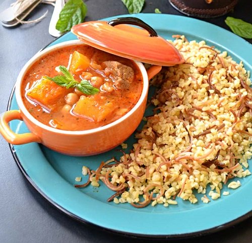 ٩-ترفع من على النار وتقدم مع الأرز المفلفل والشعيرية او البرغل بالشعيرية
