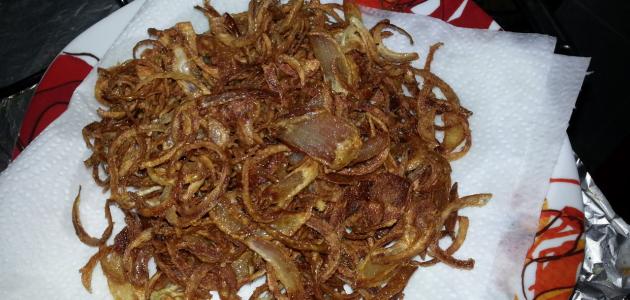 - انتشلي البصل عند الحصول على لونٍ ذهبيّ وقرمشةٍ رائعةٍ، وضعيه على الورق النشّاف ليمتص الفائض من السّمن.