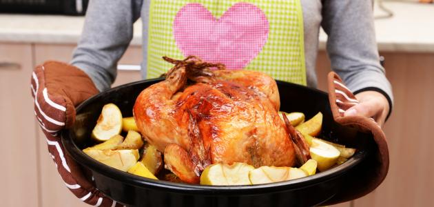 - نضع الدجاج في الفرن لمدة ساعتين على درجة حرارة متوسّطة، ونراقبه كلّ نصف ساعة للتأكد من أن هذه المدّة كافية لنضج الدجاج، حيث تختلفُ مدّة الطهي باختلافِ حسب حجْم قطع الدجاج.