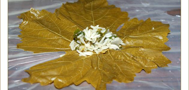 - تُنزع أعنق أوراق العنب، ثمّ توضع ملعقة كبيرة من الحشوة داخل كل ورقة، وتُلفّ كل ورقة جيّداً وتُكرّر العملية حتى نفاد الكمية.