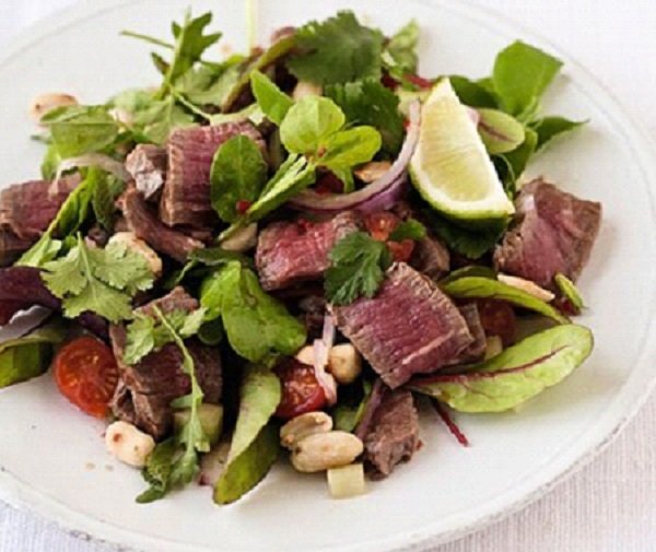 سلطة اللحم التايلندية سلطة مغذية وشهية من المطبخ التايلندي تحتوي على لحم البقر وخضار متنوعة وقطع الليمون الرائعة والفستق المحمّص اللذيذ مع صلصة تايلندية حارّة بعض الشيء ستحبونها بالتأكيد .