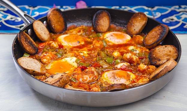 لتحضير البيض: يكسر البيض في وعاء ويسكب في الصلصة المغلية. تحرك الصلصة حول صفارالبيض بحيث يطهى البياض أولاً. أخيراً، يحرك الصفار بسرعة وتقدم فوراً.
