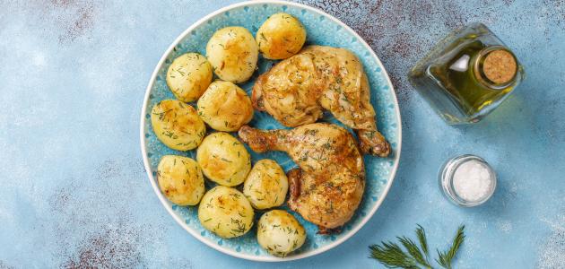 - وضع صينية الدجاج والبطاطا في الفرن لمدة ستين دقيقة إلى أن يتم نضج الدجاج والبطاطا، وتحمير السطح.