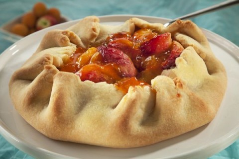 - في طبق عميق ضعي البرقوق، المشمش، السكر، الزنجبيل والنشا. باستعمال ملعقة بلاستيكية عريضة قلبي المواد لتختلط جيدا. ضعي في وسط العجينة. إثني أطراف العجينة على الحشو ولكن لا تغطيه تماما.