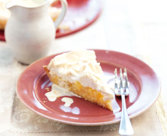 5. وزّعي الحشو على سطح العجين، وضعي “المرنغ” فوقه، باستخدام سكين. واخبزي لمدّة تراوح ما بين 20 و25 دقيقة، وذلك حتى يصبح بنيّ اللون. ودعي هذه الفطيرة تبرد لساعة، قبل تقديمها مع “الآيس كريم” (اختياري).