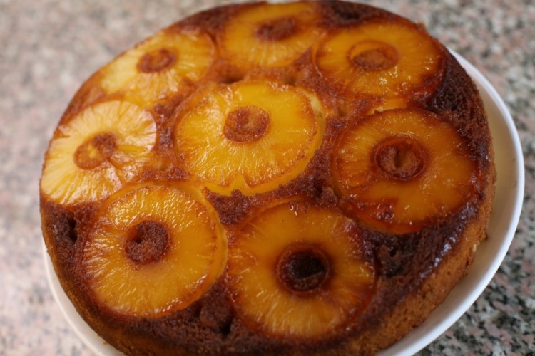 5. نصب خليط الكيك على الأناناس و تخبز في فرن على درجة حرارة 180 لمدة 35 – 40 دقيقة.
