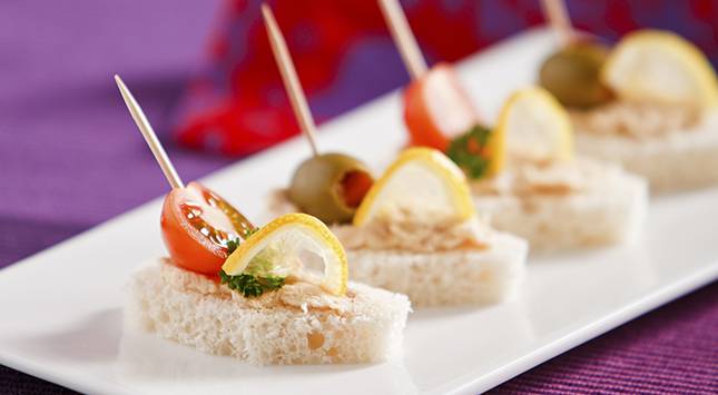 تفرد التونة على الخبز، ثم توضع شريحة من الليمون وزيتونة خضراء، ثم يغرس فيهم خلال ليتماسكوا معًا.