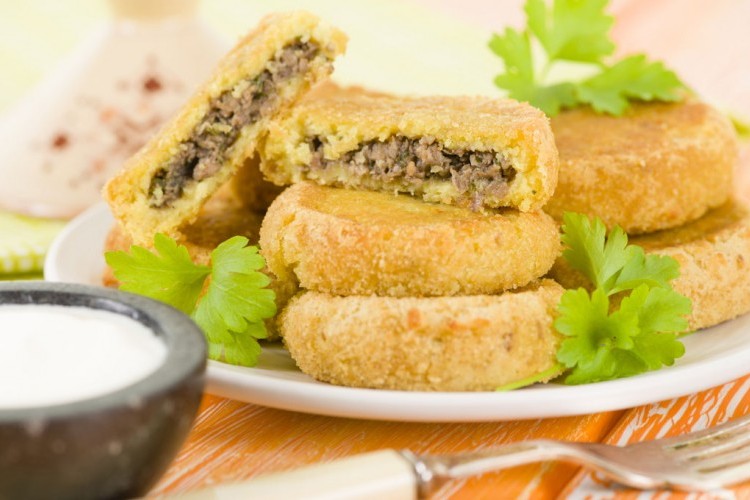 5. افردي قطع من البطاطس المهروسة على راحة اليد، واحشيها بحشوة اللحم المفروم، ثم شكليها على شكل أقراص.