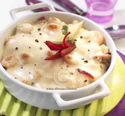 - يصفف السمك وفواكه البحر في طبق خاص بالفرن ويزين بقطع الفلفل الحار وتسكب فوقه صلصة البيشاميل حتى يتغطى.