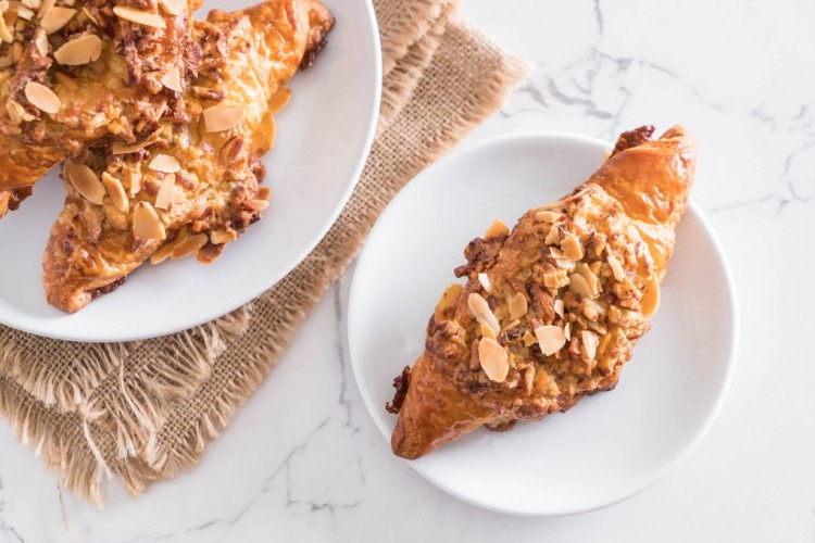 9. إعادة الكرواسون إلى الفرن والخبز لمدة 5 إلى 10 دقائق، حتى تبدأ شرائح اللوز وسطح الكرواسون في التحميص وأخذ لون ذهبي.