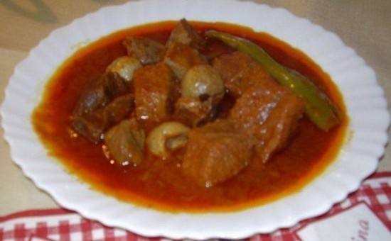 - يتم تقطيع اللحم والكبدة قطع صغيرة والبصل قطع صغيرة ثم يوضع في قدر الطبخ مع إضافة الزيت ويقلى على النار