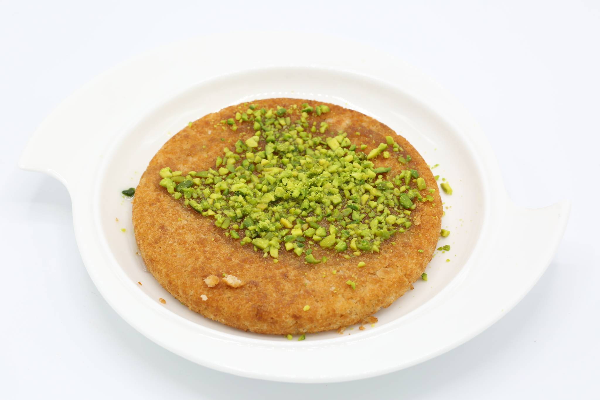 إقلبي الكنافة على طبق للتقديم، وزعي الشيرة وزيني بالفستق الحلبي.