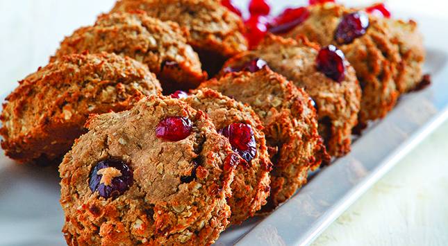 في وعاء آخر يُخلط الشوفان مع الدقيق والحليب البودرة والقرفة والبيكنج صودا، ويُقلب الخليط مع خليط الموز جيدًا، ثم يضاف التوت المجفف والزبيب.