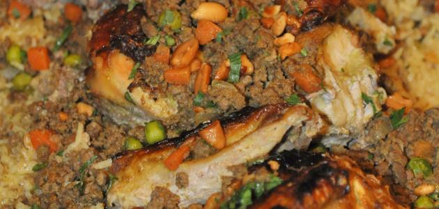 - نسكب الأرزّ في طبق التقديم، ونضع على الوجه قطع الدجاج المحمّر، ثمّ نزيّنه باللّوز والزبيب، والصنوبر.