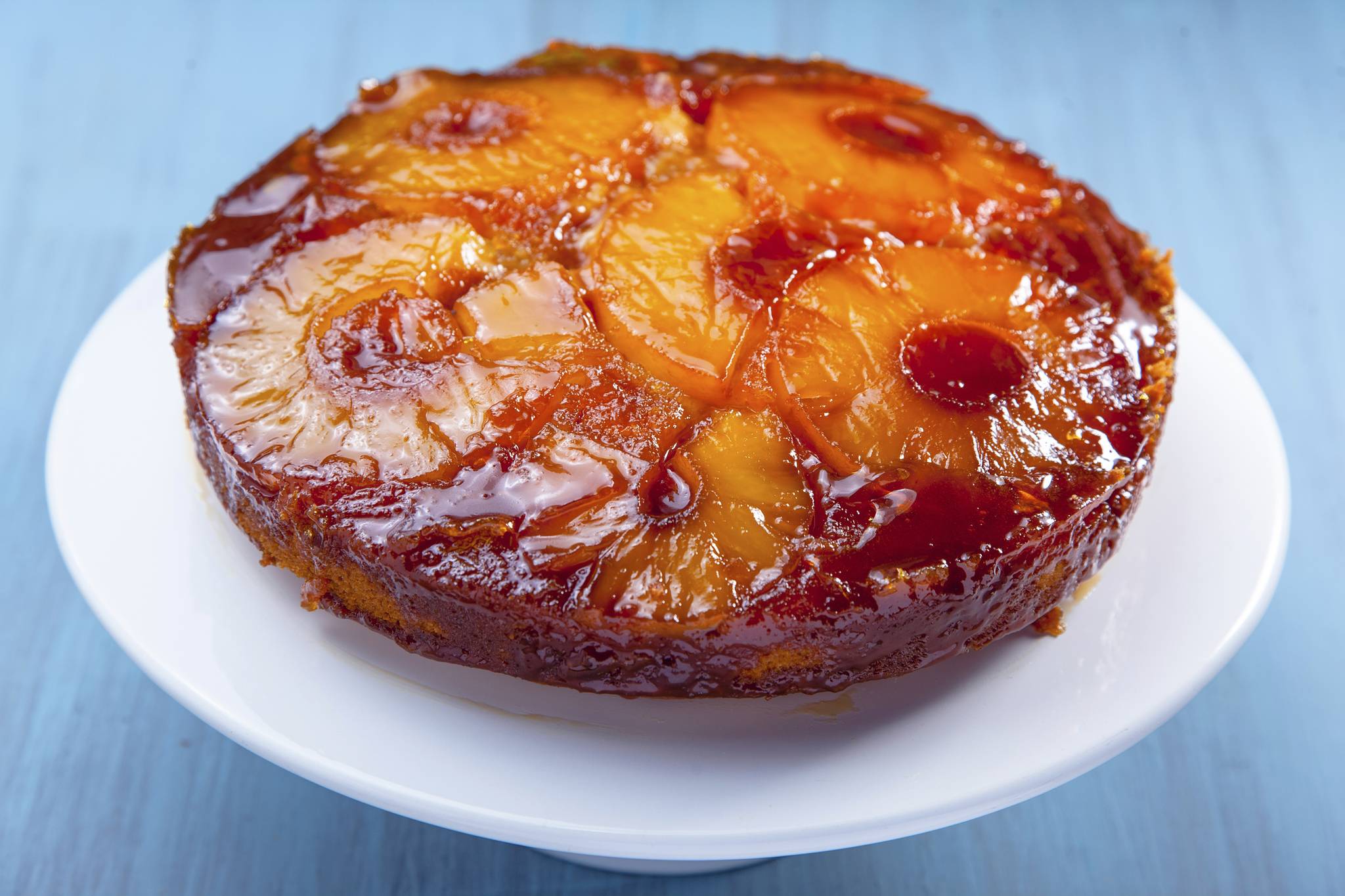 يسخن القليل من السكر في قاعدة طبق خبز دائري الشكل حتى يتحول إلى كراميل.توضع شرائح الأناناس في الكراميل.