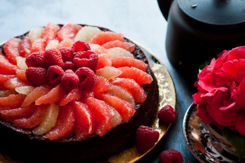 - نضع الكيك في طبق التقديم ونسكب عليه كوب الشوكولاته السائلة ثم نقطّعها ونزينها بشرائح الجريب فروت ونقدمها.