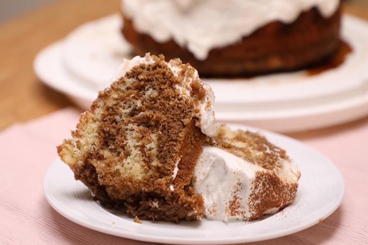 - ازيلي الكيك من الثلاجة ووزعي الكريمة على وجه الكيك وزينيه برشة كاكاو بودرة.