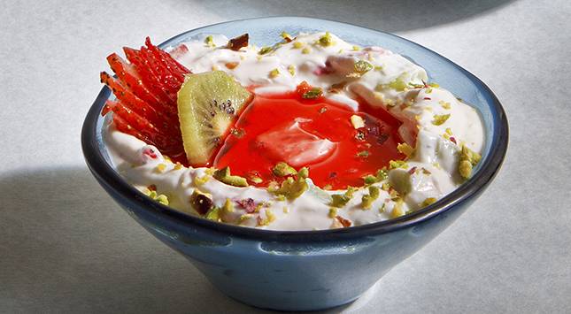 يوضع الخليط في طبق تقديم، ويُرش على الوجه الفستق المسحوق وقطر الفراولة.