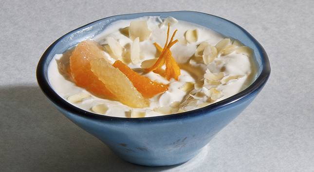 يُقشر ويُقطع البرتقال والجريب فروت والليمون، ويُخلطوا مع اللبنة في وعاء.