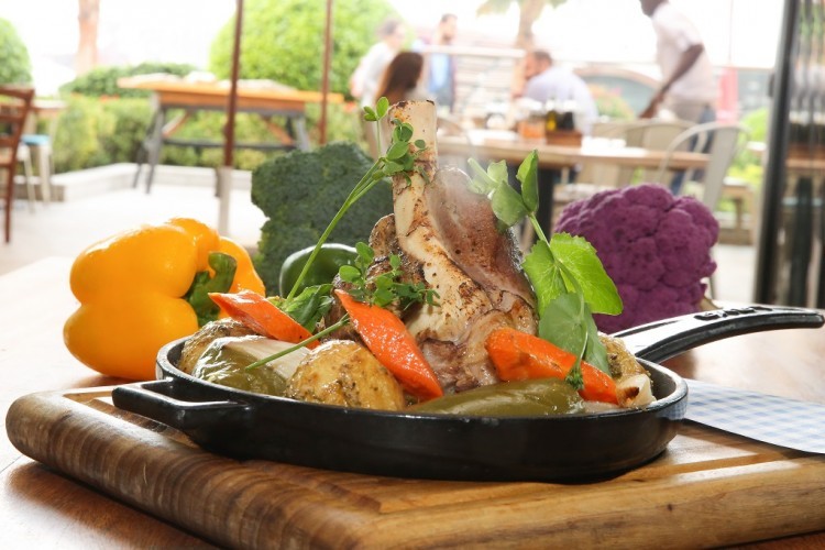 3. طريقة التقديم: يوضع ساق لحم الضأن في طبق التقديم، وتوزَّع الخضراوات المشويَّة حوله.