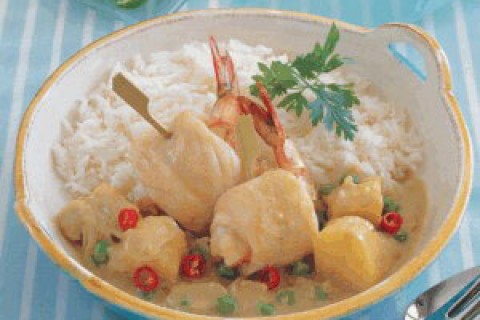- يُحمّى الزيت في مقلاة كبيرة ثم يُضاف إليه البصل ويُطهى لمدة 2 أو3 دقائق إلى أن يصبح طريّاً. يُضاف معجون الكاري ويُحرّك إلى أن تفوح رائحته، ومن ثم تُضاف بودرة حليب جوز الهند ماجي، الماء، وعود الليمون الحامض، البازيلا، البطاط ومكعّبان من مرقة الدجاج ماجي مل