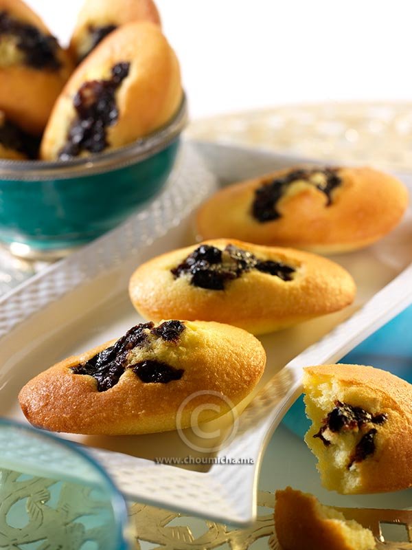 - يوزع العجين على قوالب مادلين مدهونة بالزبدة ويزين سطحه بكومبوت البرقوق.