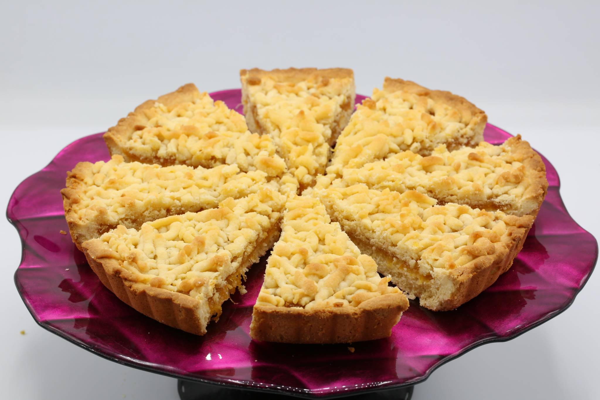 خذي مقدار العجينة المتبقي وباستعمال مبرشة الجبن أو الخضراوات إبرشيه على سطح المربى بطريقة عشوائية لتغطي المربى تماما. لا تضغطي على العجينة أو تساوي السطح.
