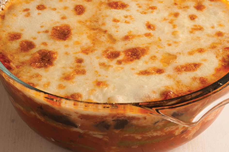 توزع صلصة الطماطم على صينية الخبز. يوضع نصف الباذنجان والفلفل كطبقة على الصلصة ويُرش القليل من جبن البارميزان.