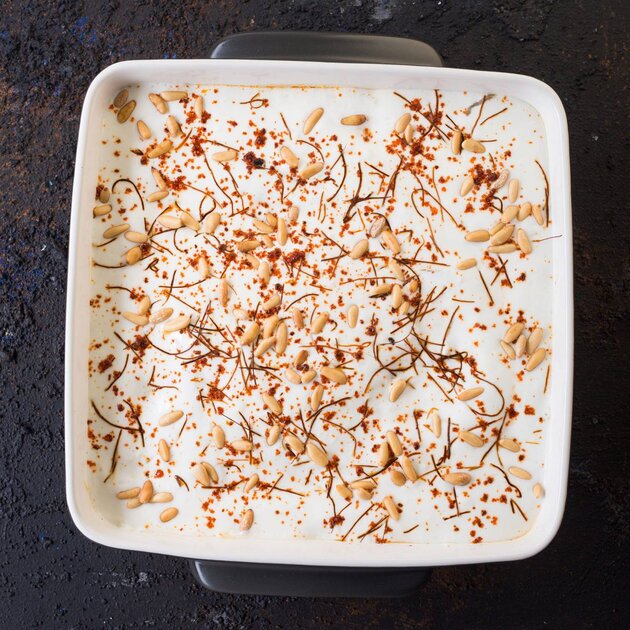 بمجرد أن تقوم حمامة الموساكا بنشر صلصة الزبادي يتبعها الصنوبر والجوز