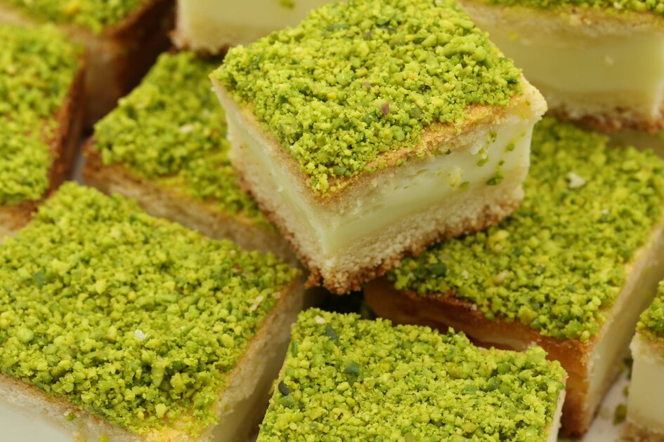 مباشرة فور إخراج المعمول من الفرن وزعي عليه كمية وفيرة من الفستق الحلبي المطحون. دعي المعمول في القالب ليبرد تماما.
