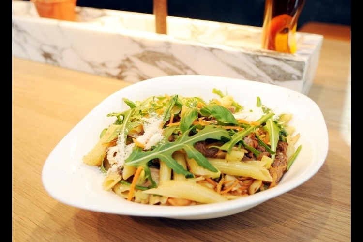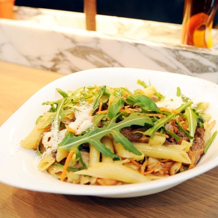 5 يسكب هذا المزيج في طبق، ويزين بأوراق الجرجير وجبن “الباراميزان” حسب الرغبة.