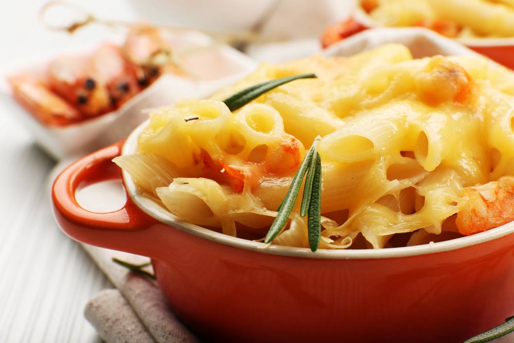 - اخلطي المكرونة مع كريمة الطبخ وصلصة البشاميل و الجبن والملح والفلفل والجمبري .