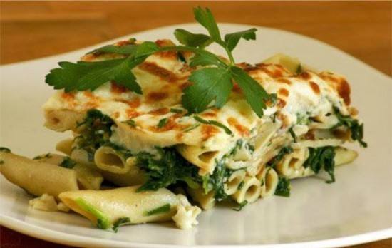 - وتجهز صينيه الفرن تضعى كميه المكرونه بالسبانخ والبشاميل وتغطى الصينيه بكميه البشاميل المتبقى وترشى الجبنه المبشوره ودخليها الفرن مباشره لمده 15 دقيقه ثم تقدم .