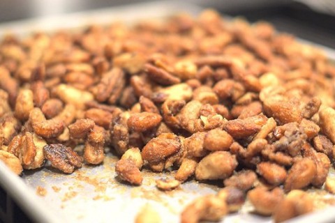- فى صينية نوزع المكسرات جيدا فى طبقة واحدة ونضعها فى الفرن عند درجة حرارة 160 ونتركها لمدة 10 دقائق حتى تتحمص.