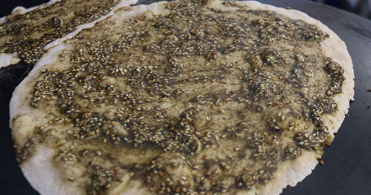 5- ضعي كرة من العجين على سطح العمل المنثزر بالدقيق. بواسطة النشابة، إفردي العجينة حتى تصبح مسطحة. ضعيها على الصاج المحمّى مسبقاً وادهنيها بالزعتر. اطهيها حتى تنضج.