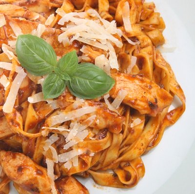 فيتوتشيني بالدجاج مكرونة ايطالية بامتياز بصلصة حمراء مع الدجاج من الضروري تجريبها . حضّروا المكونات و لنبدأ الطهي.